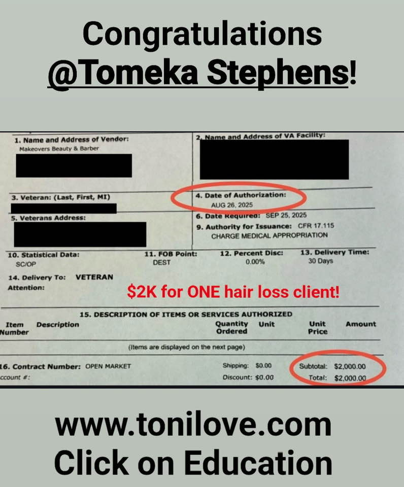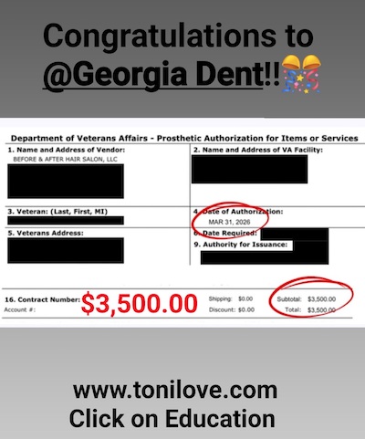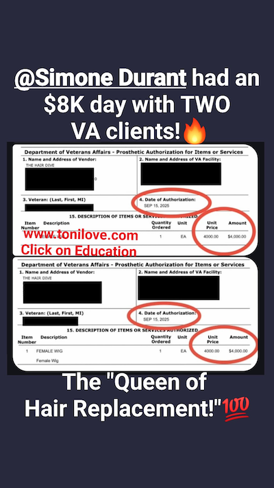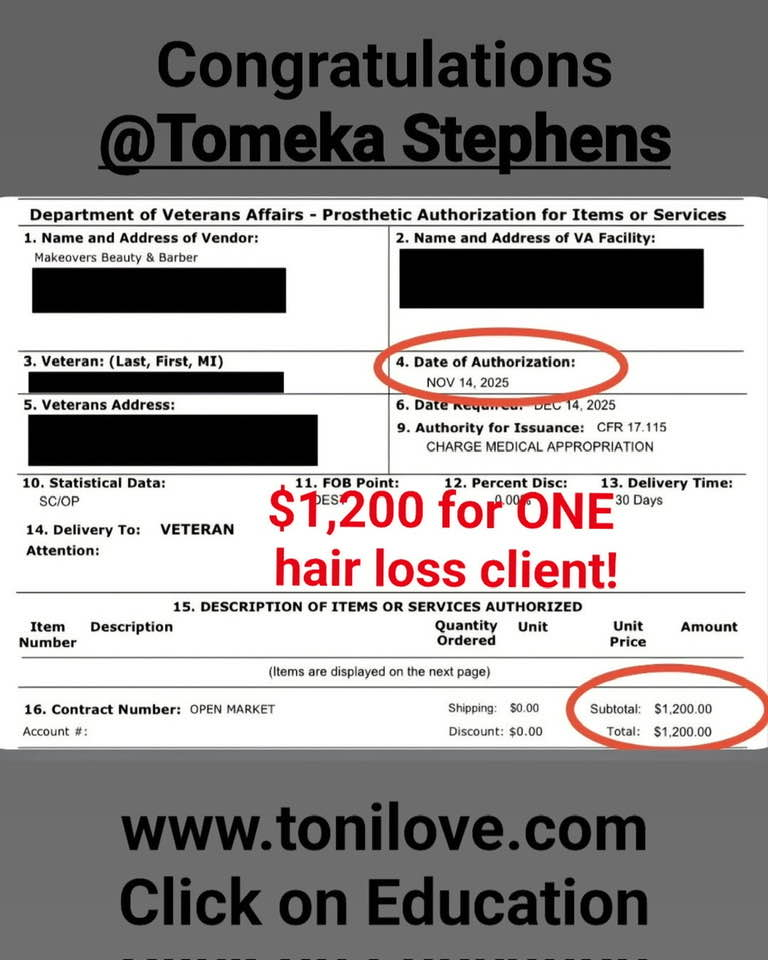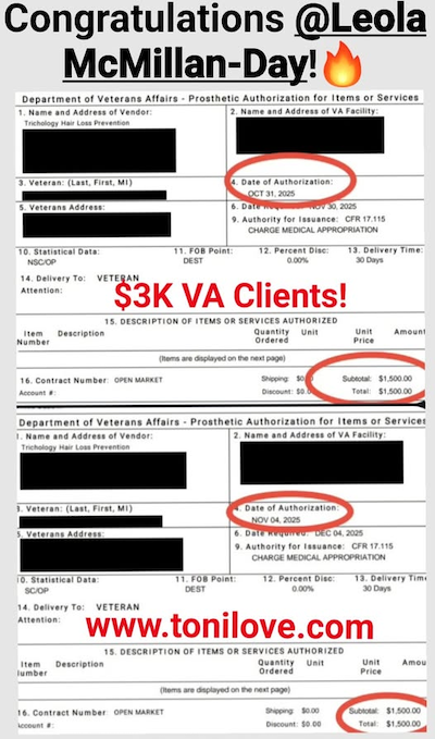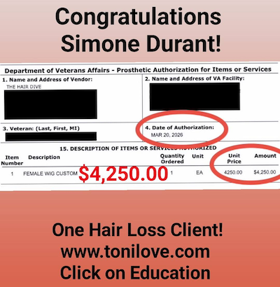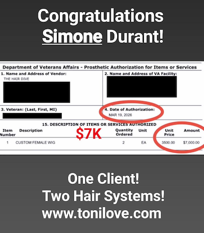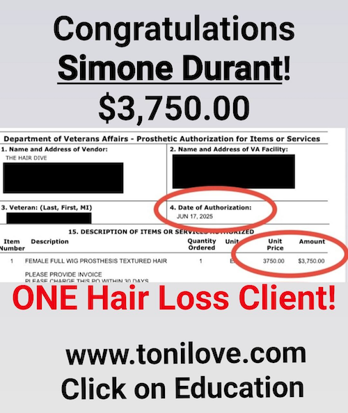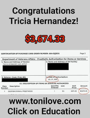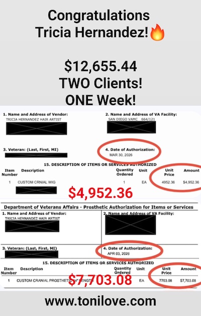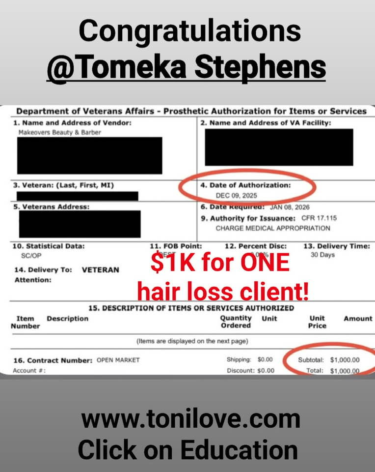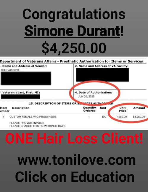 She has a contract with the VA to service hair loss clients. She was paid $775.00 for her client!!