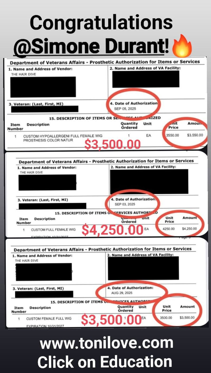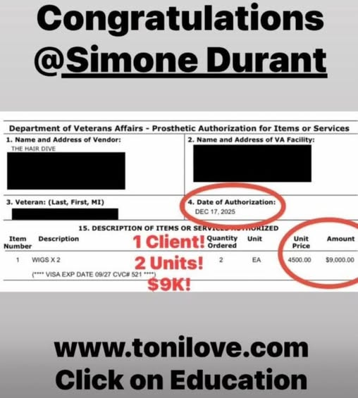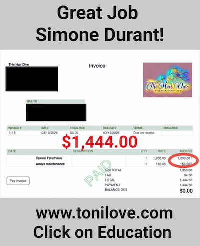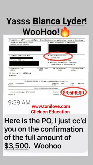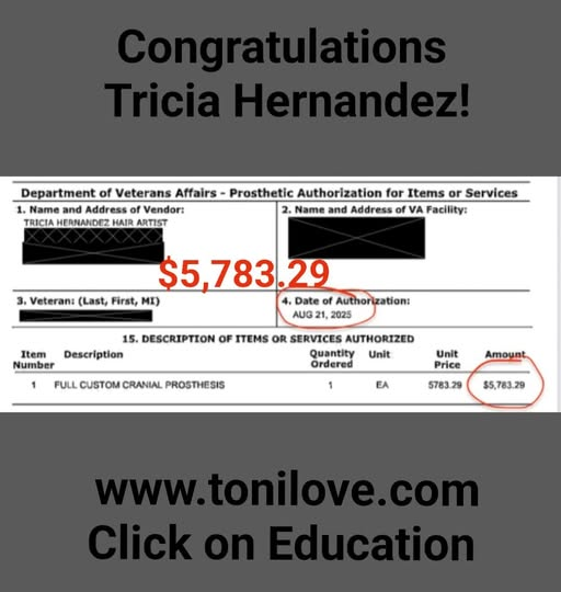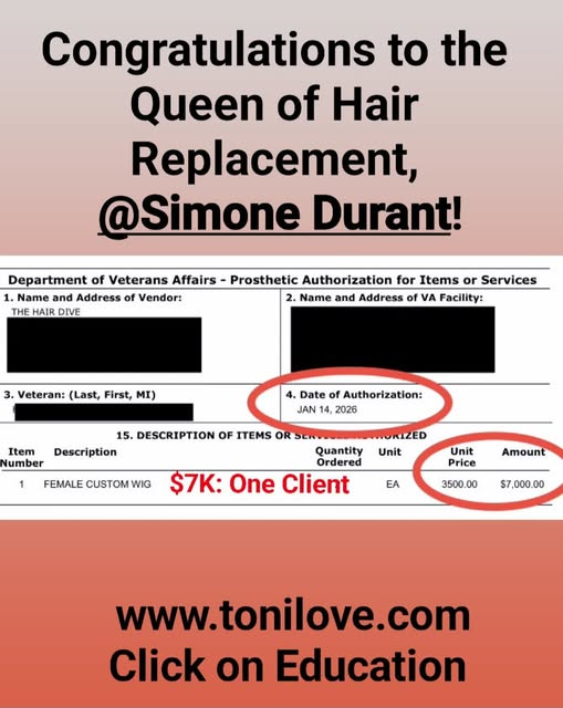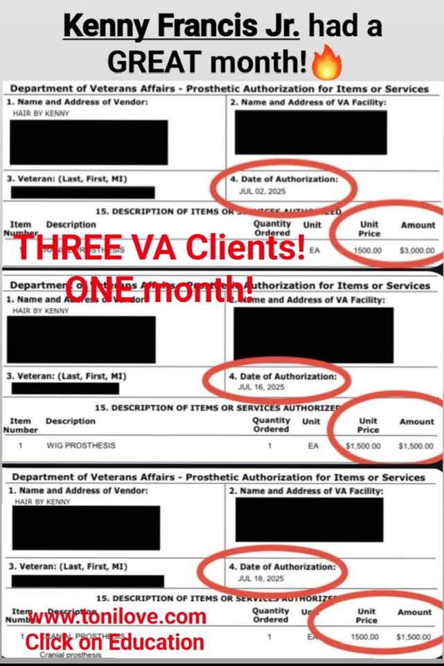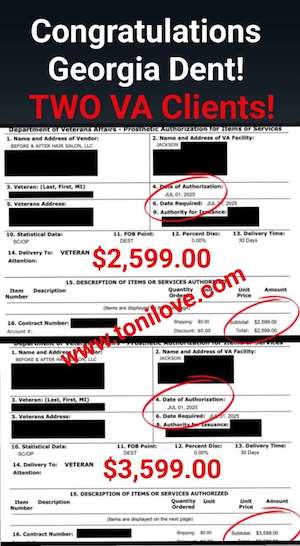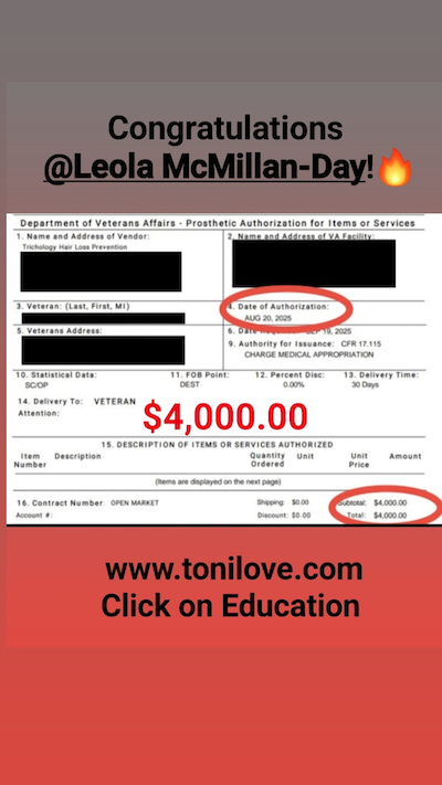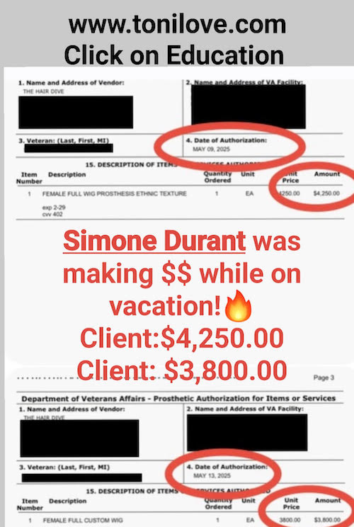 She has a contract with the VA to service hair loss clients. She was paid $775.00 for her client!!