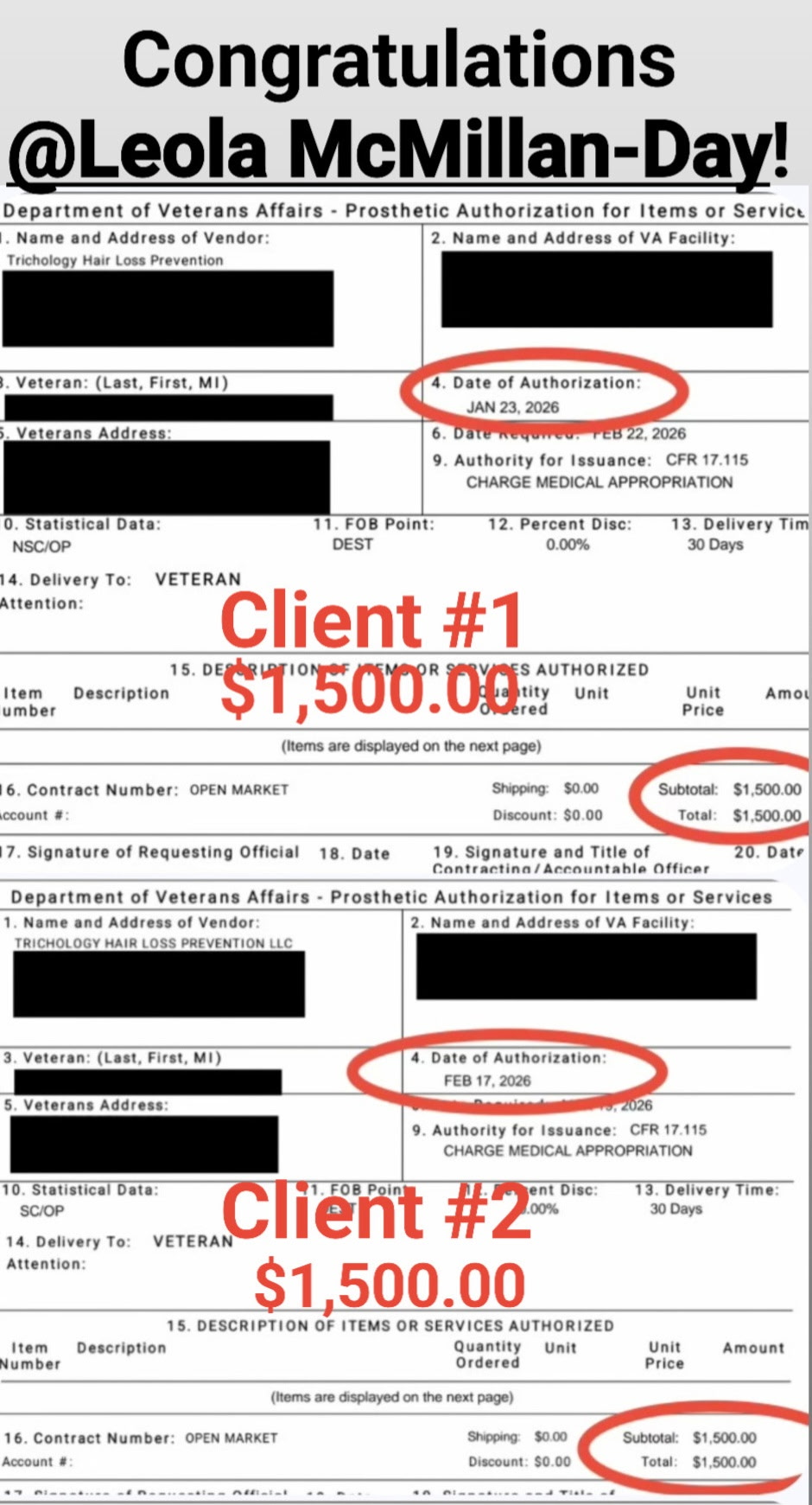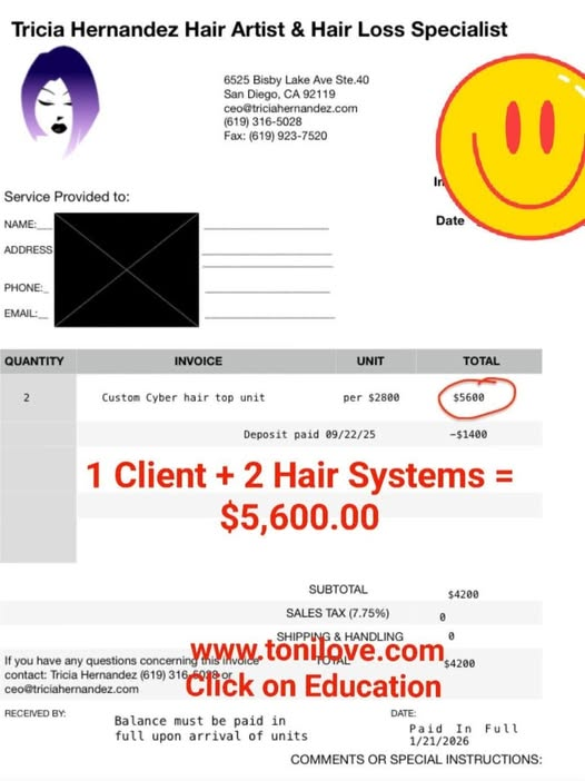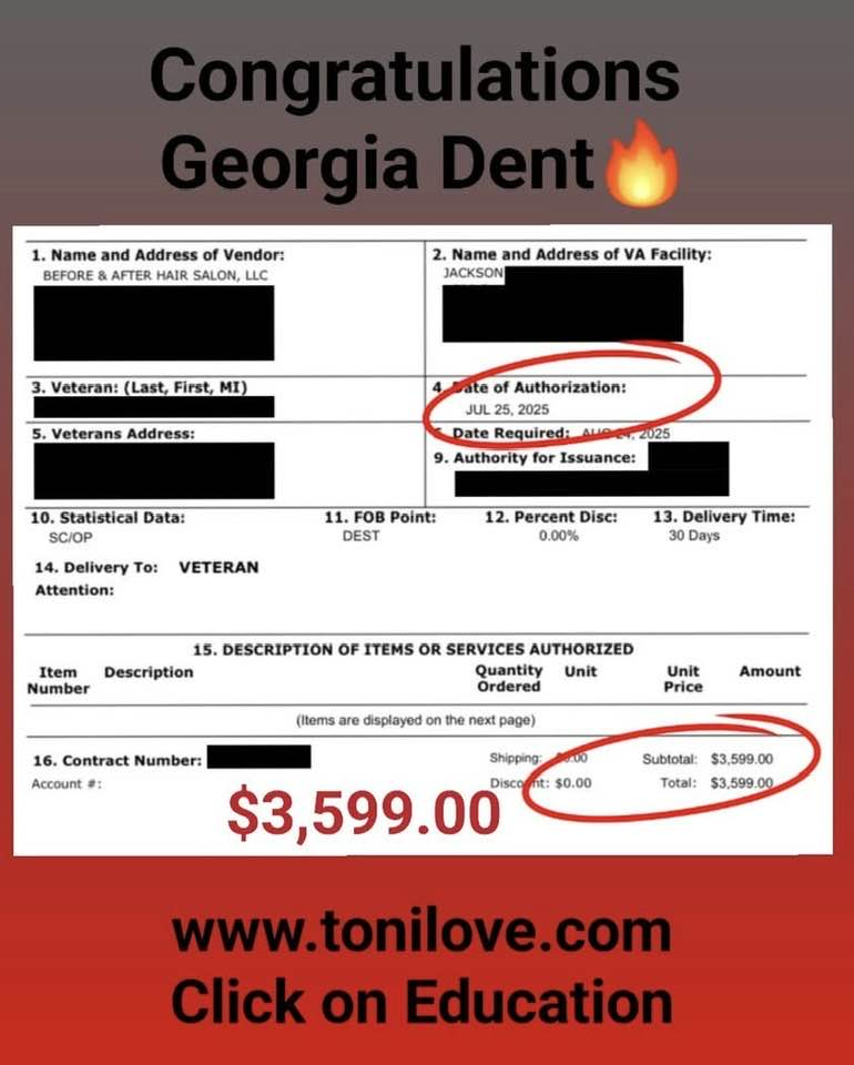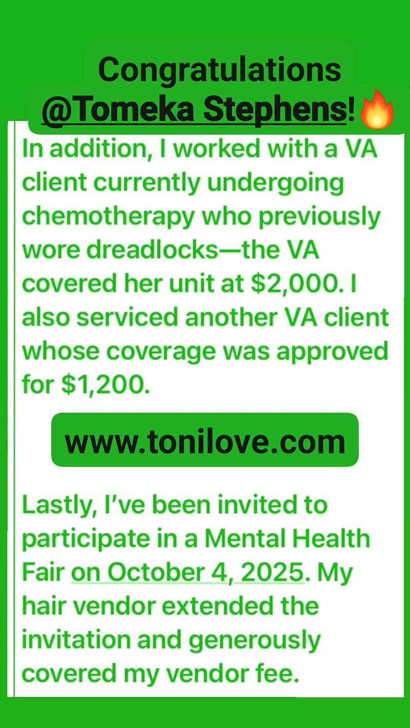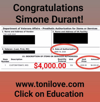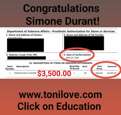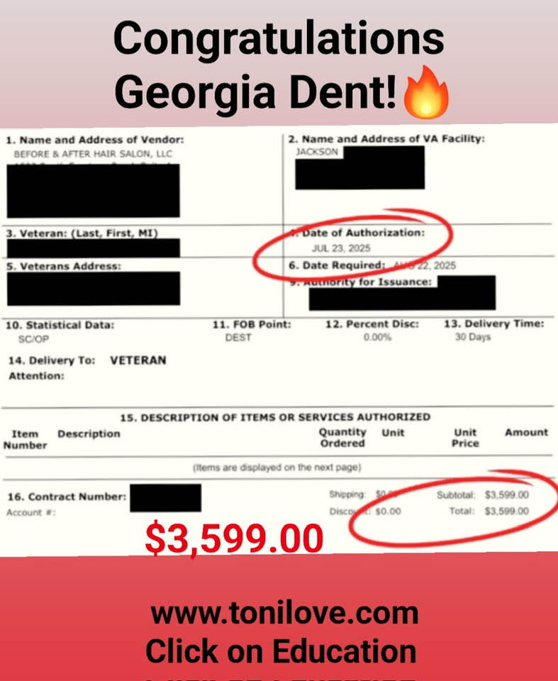She has a contract with the VA to service hair loss clients. She was paid $775.00 for her client!!