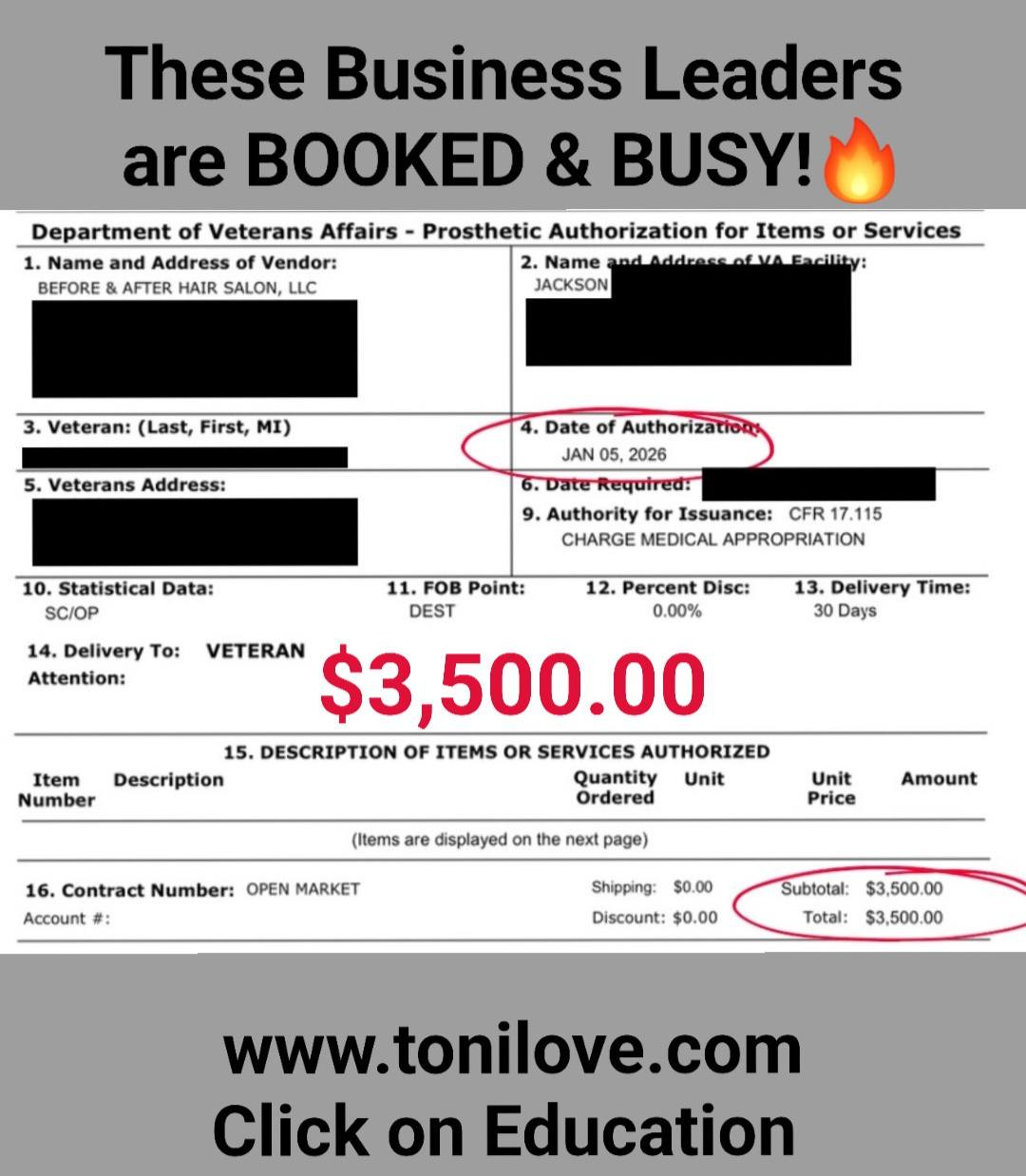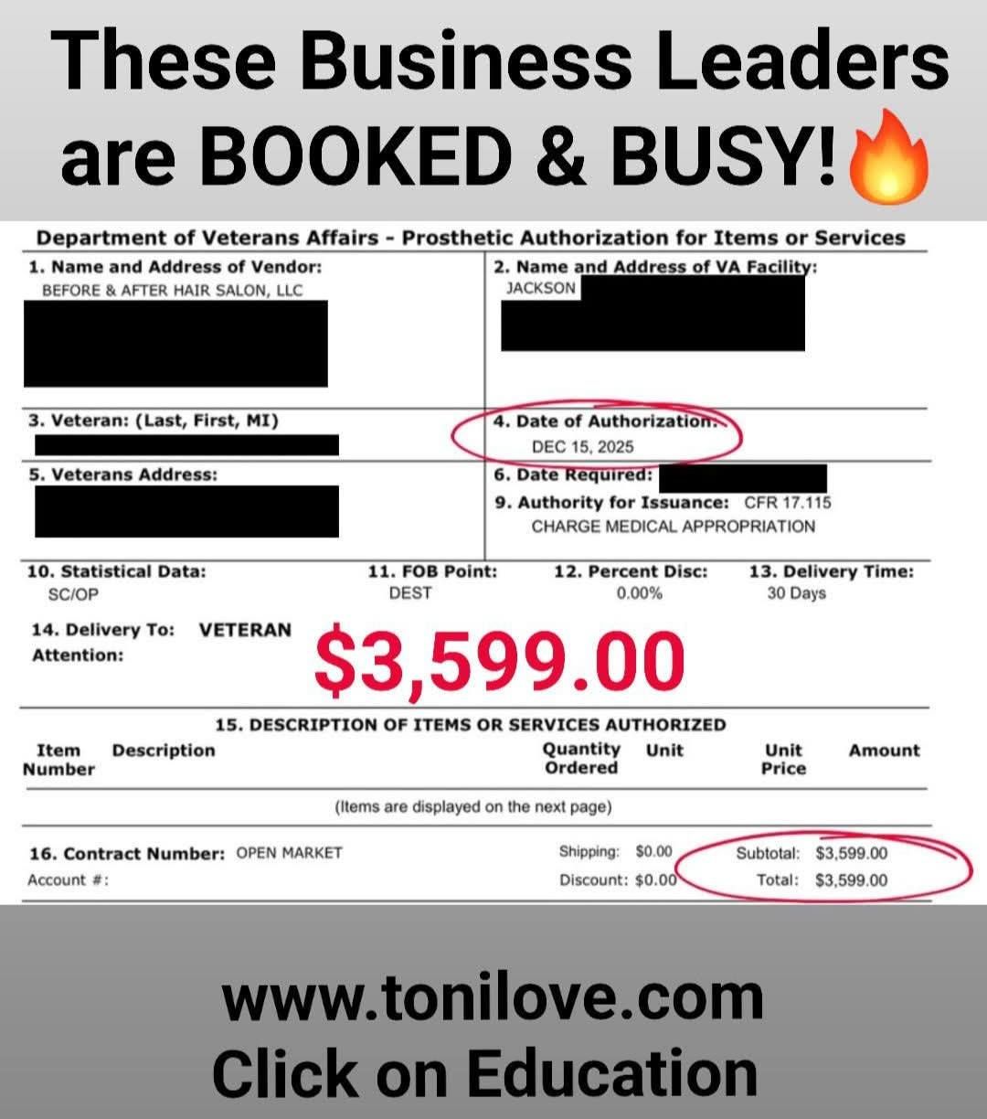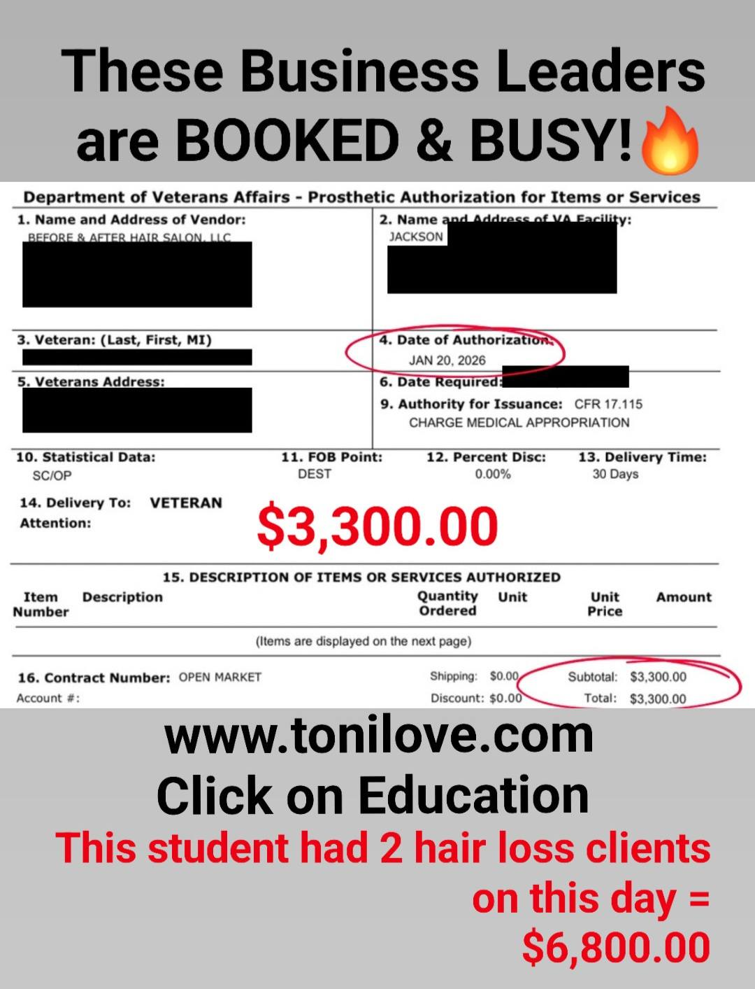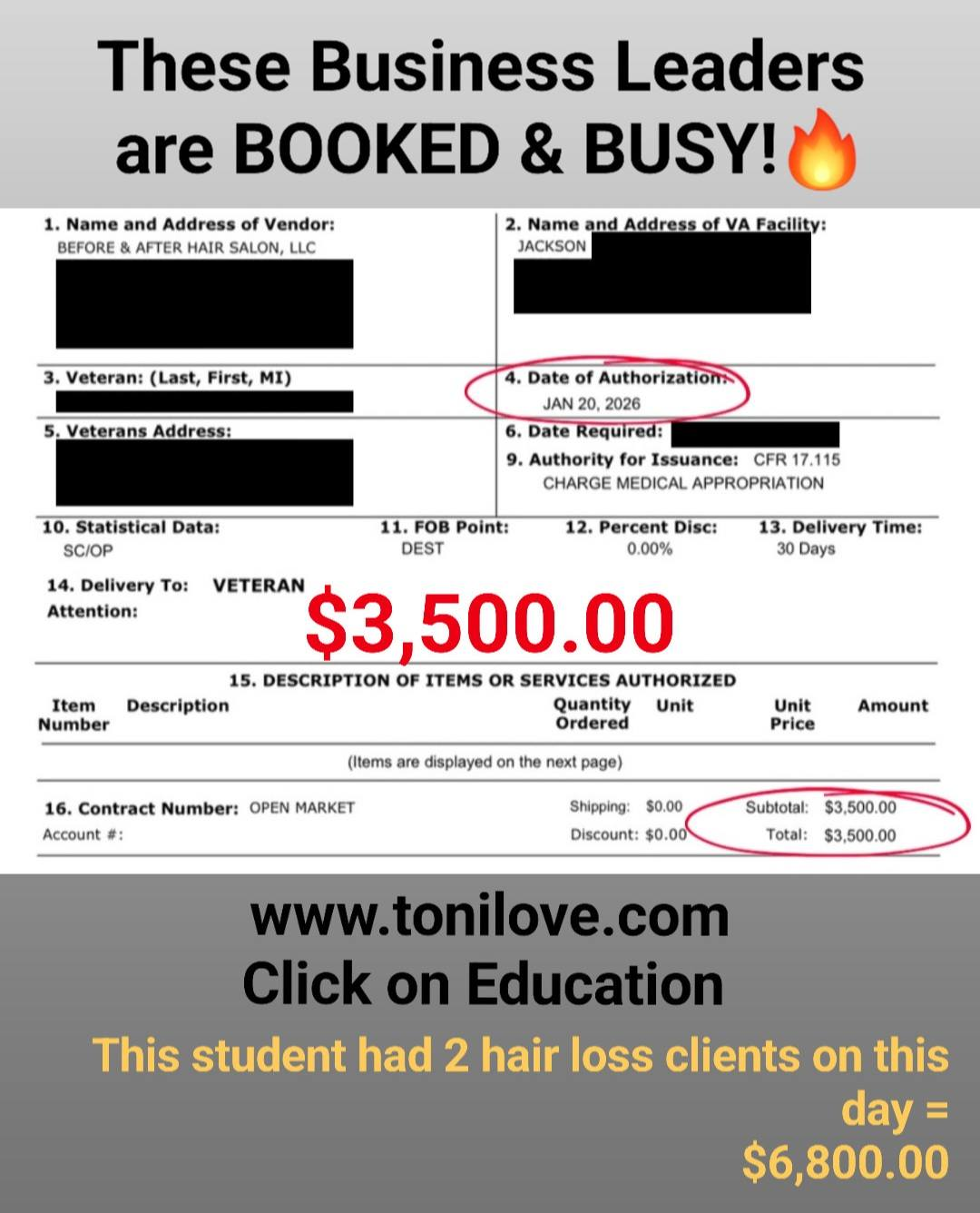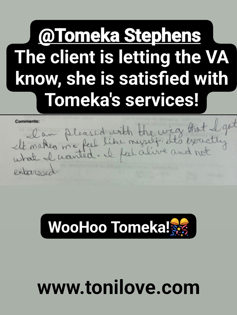 She has a contract with the VA to service hair loss clients. She was paid $875.00 for her client!